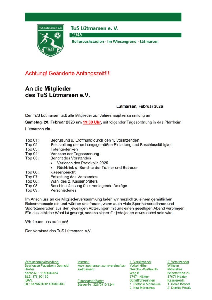 Feb. 7, 202607/02/2026 Update! Neue Startzeit JHV TuS Lütmarsen by TuS Lütmarsen Die Startzeit für die Jahreshauptversammlung vom TuS Lütmarsen hat sich etwas nach vorne verschoben.Die Versammlung startet nun am 28.02.2026 um 19:30 Uhr, statt wie ursprünglich geplant um 20:00 Uhr.